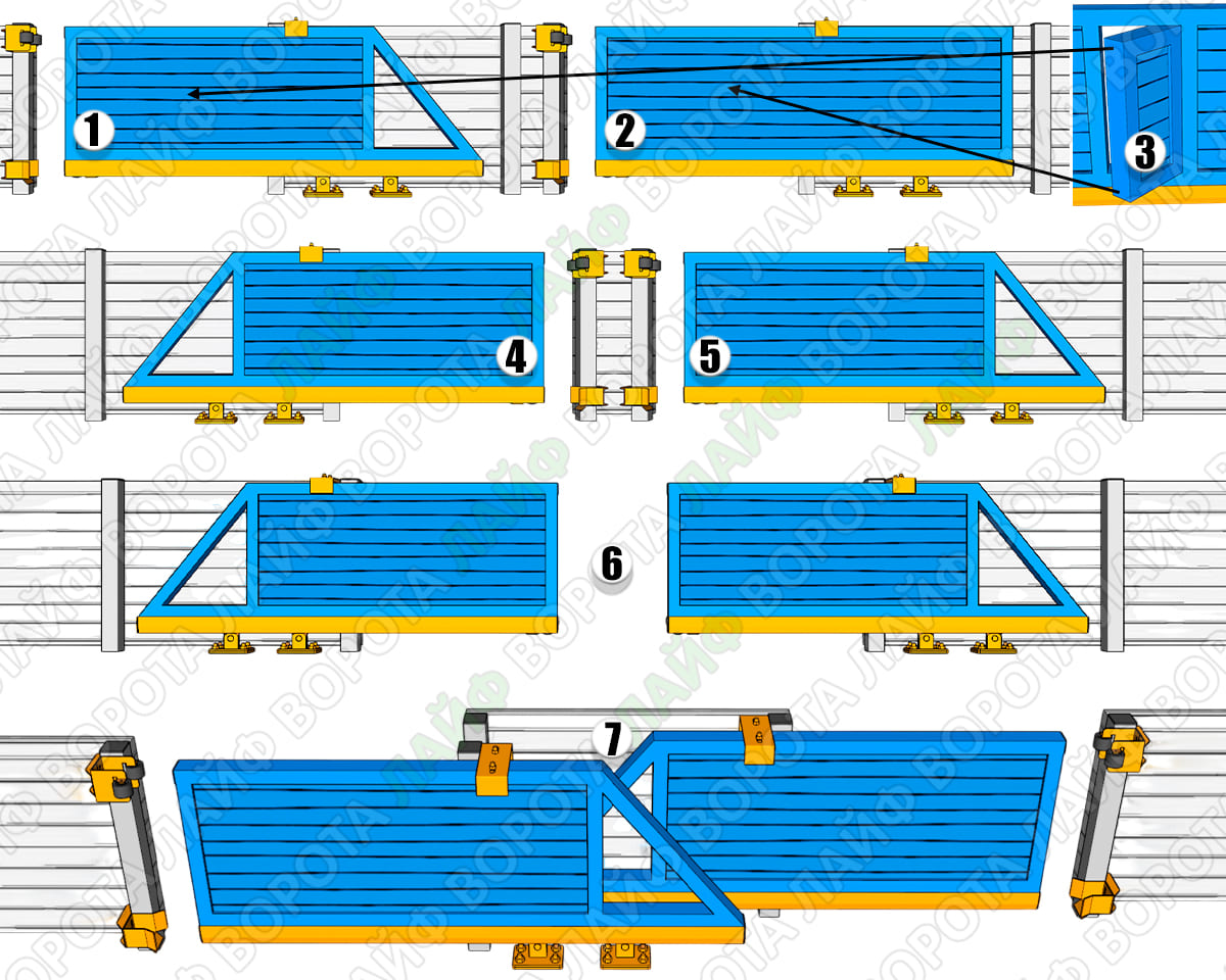 Ворота утримуються «у повітрі» за рахунок напрямної балки та роликових опор, встановлених на бетонному фундаменті осторонь проїзду. При відкритті секція просто від'їжджає вздовж паркану, використовуючи фізику противаги.