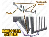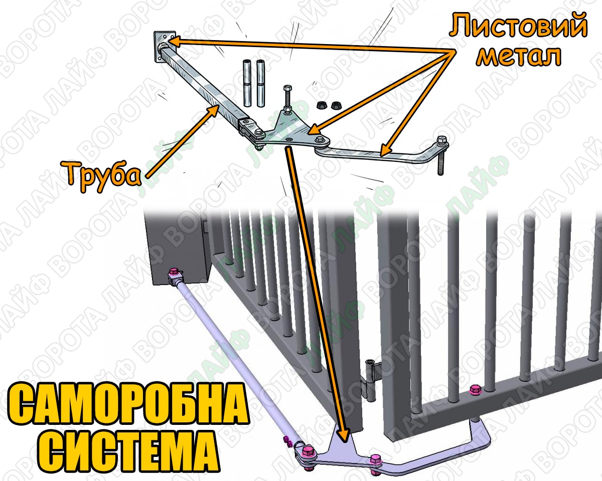 Тепер розглянемо другий варіант — так звану «економ систему» важелів накладного монтажу. По суті, це саморобний набір деталей, який повторює загальну ідею складних воріт, але лише на мінімально можливому рівні.
