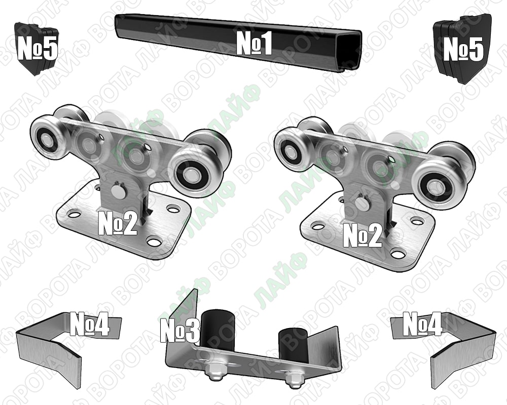 Комплект дозволяє зібрати конструкцію з шириною прорізу до 5 метрів із використанням 2-х роликових кареток. Якщо ширина більша за 5 метрів, рекомендується використовувати 3 і більше каретки для рівномірного розподілу навантаження.