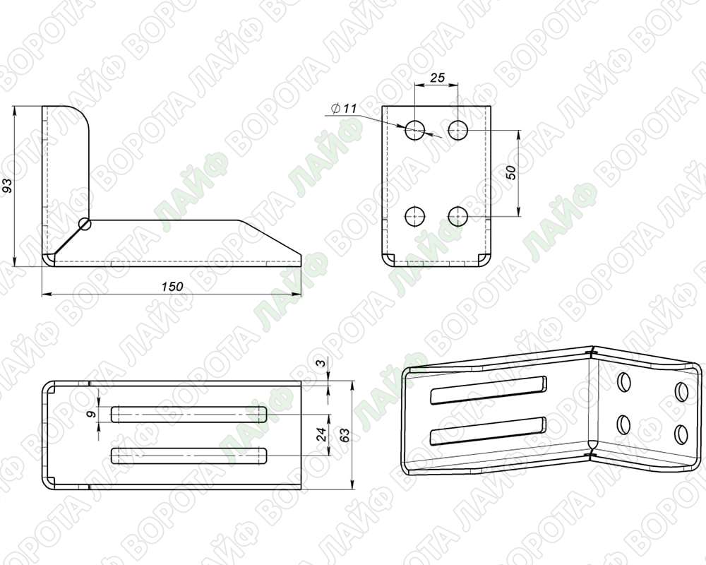 Оцинкований кронштейн для кріплення до вертикальної поверхні нижнього та верхнього уловлювачів відкатних воріт та зсувних конструкцій. Максимальне навантаження 500 - 800 кг