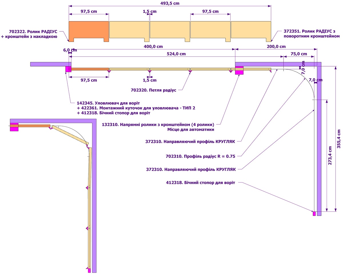 Нижче як приклад показано схему та список комплектуючих для ширини заїзду 4 метри:
