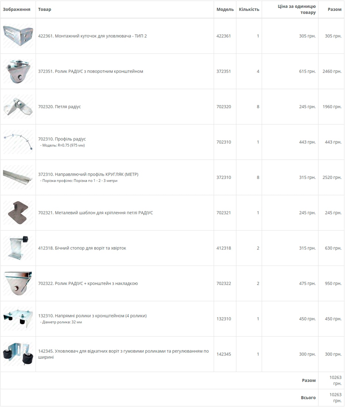Пропонуємо професійну послугу індивідуального підбору фурнітури для поворотних відкатних воріт «Радіус». Наші фахівці підготують персональну монтажну схему та укомплектують проєкт усіма необхідними елементами з урахуванням параметрів ваших воріт і особливостей радіусної конструкції.