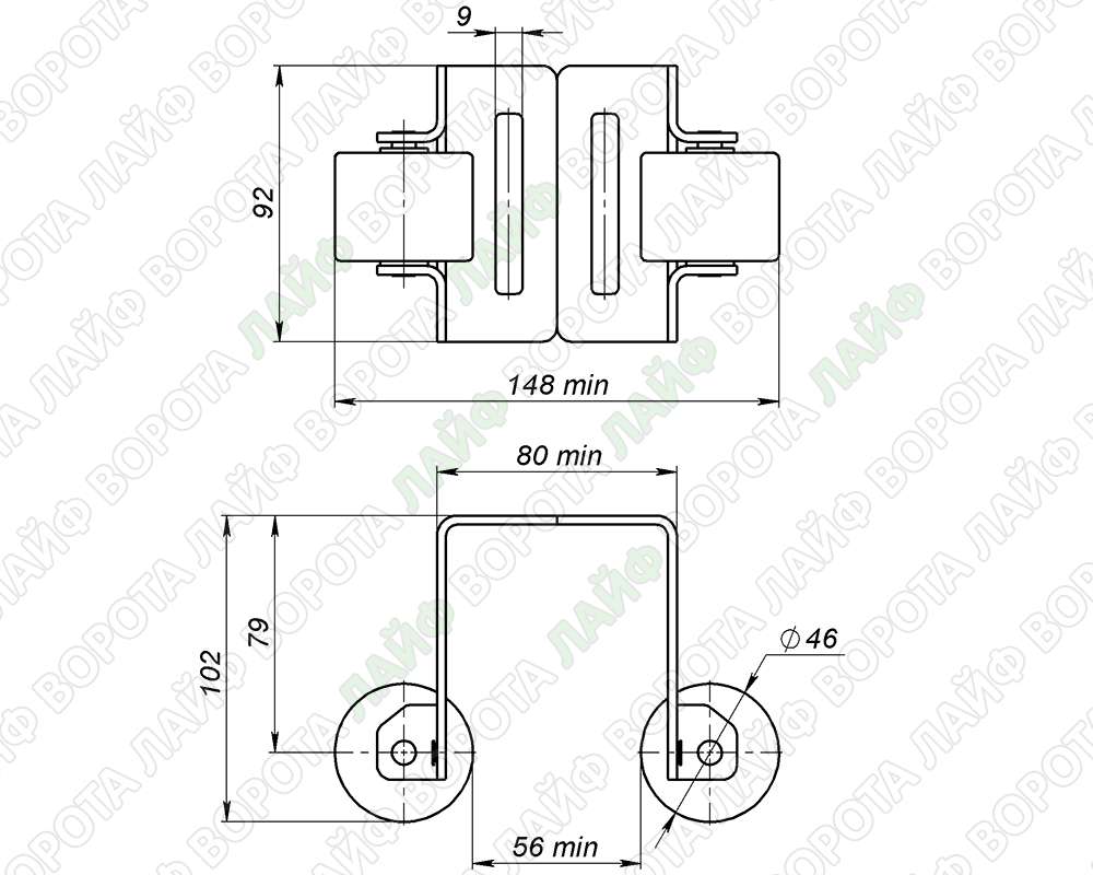 На задней стенке предусмотрены два вертикальных монтажных отверстия, что позволяет отрегулировать высоту и ширину улавливателя под любую толщину каркаса. Конструкция состоит из двух половинок — подходит для любых откатных ворот.